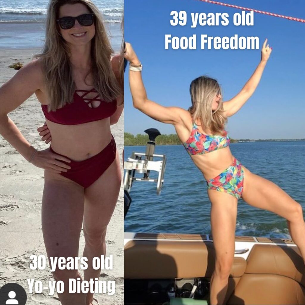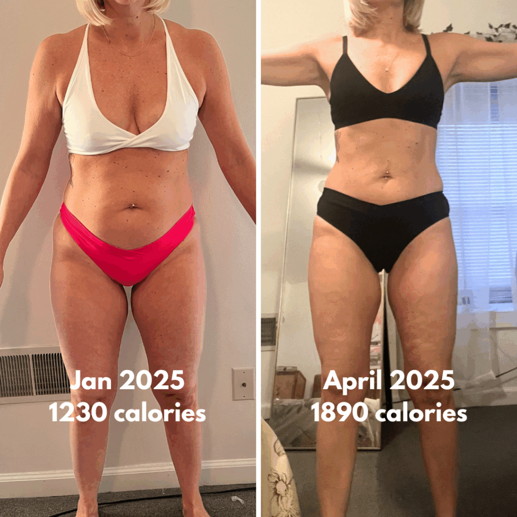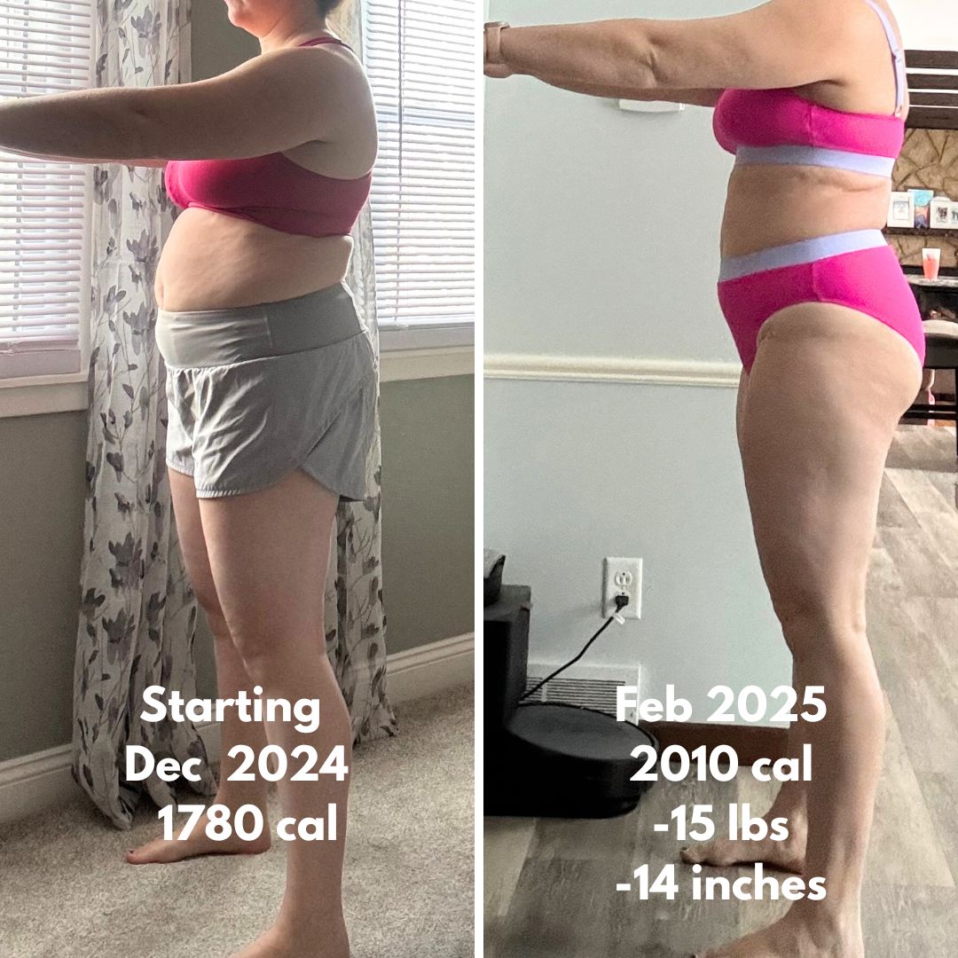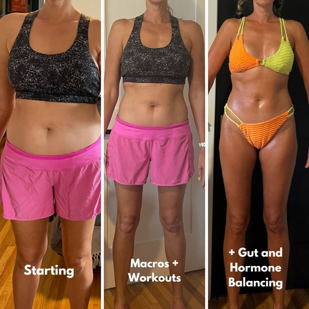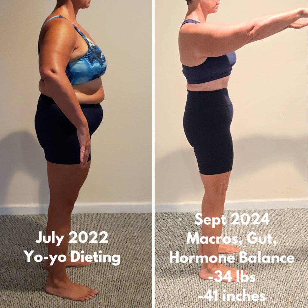 In perimenopause losing weight felt harder, even eating 1300 calories a day. I had chronic digestion issues, headaches weekly, and body aches. Immediately we ran labs and found my root cause issues that were causing my symptoms. Now I’m happy to say I have consistent digestion and feel better in my mid-40’s! My personal nutrition plan made a huge difference, I’m never starving and can eat pizza, burgers, martinis and wine!